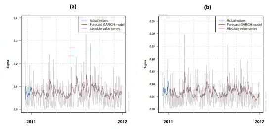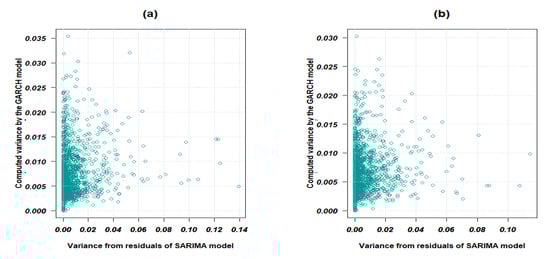 was used. This function uses a variant of the Hyndman–Khandakar algorithm, which combines unit root tests, minimization, and the maximum likelihood estimator (MLE) to obtain an ARIMA model [53]. The orders d and D were obtained from the stationarity and periodicity criteria applied to the data series.2.5. GARCH Model