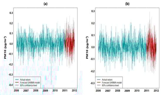 Forecasts on the horizon of the SARIMA-GARCH model of PM10 data in (a) GPE and (b) PR.