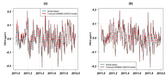 Appendix A.4. Forecast of the Coupled SARIMA-GARCH Model of PM10 Data in GPE and PR