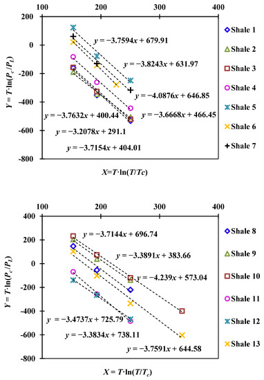 In this work, 13 sets of data for methane adsorption on shales at different temperatures (38 °C, 65 °C, 100 °C, 150 °C) were selected to calculate the characteristic value k of methane adsorption on shale [7]. The PL values at different temperatures, as well as the calculated “X = T·ln(T/Tc)” and “Y = T·ln(Pc/PL)” are shown in Table A1 in Appendix A. The linear relationship determined by the “X” and “Y” values is shown in Figure 1, and the slope is the k value.