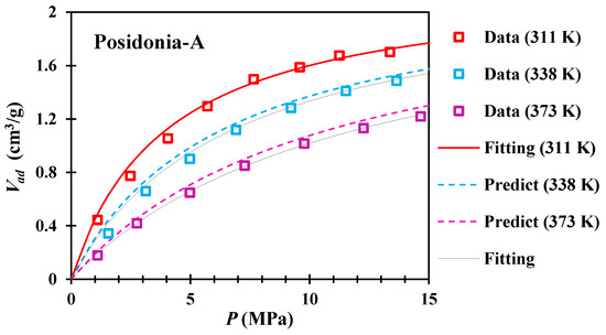 Further, we use the adsorption data in Gasparik’s (2014) work [7] to validate our model. We select methane adsorption isotherms at low temperature, i.e., T = 311 K (38 °C) to predict methane adsorption at high temperatures, i.e., T = 338 K (65 °C), 373 K (100 °C) and 423 K (150 °C).
