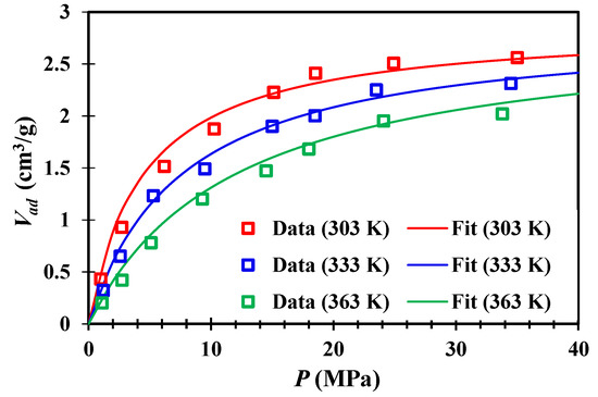 In this study, the methane adsorption data at 303 K (30 °C), 333 K (60 °C), and 363 K (90 °C) were tested and shown in Figure 5. The adsorption data were fitted by the Langmuir model. During the fitting process, the maximum adsorption capacity Vm is kept as a constant, and only the Langmuir pressure PL changes with temperature, and the values of related parameters are shown in Table 2.
