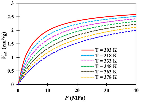 Studying the methane adsorption capacity of shale under reservoir conditions is the basis for the development of shale gas reservoirs, and it is also critical for predicting gas reservoir resource and productivity evaluation [1,2,3]. Generally, the evaluation of the adsorbed gas content of shale is mainly based on experiments, and adsorption experiments at low temperature condition are easily conducted (such as below 65 °C [4,5]). However, the actual temperature in the geologic system of a shale reservoir is generally between 80 °C and 150 °C [6], and even as high as 175 °C [7,8]. The adsorption isotherm under low temperature (below 65 °C) will have a large gap with this under geologic temperature conditions. Since the temperature is one of the main factors affecting the adsorption capacity of shale, it is also one of the necessary research factors to evaluate the adsorption capacity of shale under reservoir conditions. At the same time, most experiments are based on a constant temperature. A single test can only obtain the relationship between methane adsorption capacity and pressure at a certain temperature; if we want to understand the relationship between shale adsorption capacity and pressure at different temperatures, we need to carry out several tests of adsorption at different temperatures [9]. Therefore, the prediction of adsorption curves at other temperatures (high temperature) through a small number of adsorption isotherms at known temperatures (low temperature) will be of great significance to the development and evaluation of shale gas reservoirs.