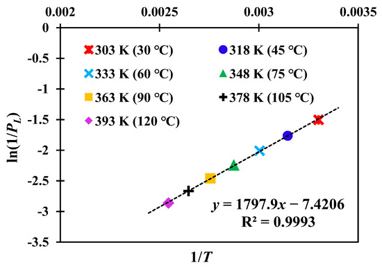 Further, we can determine the adsorption heat for methane adsorption on our studied shale, which is an important thermodynamic parameter for adsorption. Xia and Tang (2012) [36] deduced the relationship between the Langmuir constant (1/PL) and temperature (T) based on adsorption thermodynamics, which is given by: