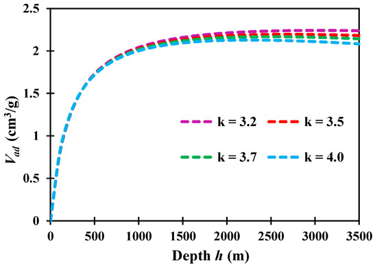 Bedsides, it is found that the adsorption capacity Vad does not monotonically increase with the growth of burial depth h. This phenomenon is caused by the coupling effect of pressure and temperature on gas adsorption. Deeper burial depth leads to larger reservoir pressure, which has a positive influence on gas adsorption. At the same time, however, a deeper burial depth also leads to a higher reservoir temperature, which has a negative effect on gas adsorption. Based on this work, we found that a larger k value leads to a more obvious decrease in gas adsorption at greater depth, indicating that the k value mainly dominates the sensitivity of the gas adsorption to temperature. As the value of k grows, the effect of temperature on gas adsorption becomes significant.
