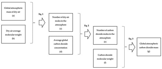 According to Fraser et al. [8], the global atmospheric carbon content was 7.15 × 1014 kg in 1980. The authors suggest Figure 1 as a schematic representation of the complex procedure which was used in [11] to estimate the global atmospheric carbon dioxide mass. The validation of the proposed methodology can be performed by comparing the results using the following steps. As shown, the first step is the calculation of the number of dry air moles (block c) in the atmosphere by dividing the global atmospheric mass of dry air (block a) by dry air mean molecular weight (block b) according to Equation (1):