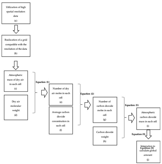 Building blocks for the proposed methodology to reach a higher accuracy of the results for global atmospheric carbon content. Letters (a–j) are used to label the blocks in order to simplify mentioning the steps in the text.
