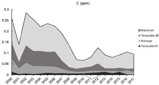 According to Guanajuato’s Ecology State Institute [13], non-compliance with SO2 and PM10 regulatory standards is the principal factor that causes environmental pollution precontingencies in industrialized municipalities with considerable mobility, such as the region studied. The national air quality report [14] indicated that, in Salamanca, the minimum number of days that exceeded some norm between 2000 and 2017 was 48, and the maximum was 175. In the same way, this indicates that in 2017, the number of pollutants that exceeded the maximum on 1, 2, and 3 days simultaneously was 77, 13, and 3, respectively. Sulfur dioxide (SO2) is a colorless gas with an irritating odor. Practically, 50% is deposited on the surface, presenting a short half-life in the atmosphere. Its reducing power converts it into SO3, which, due to its high solubility with air humidity, transforms into sulfuric acid (H2SO4), an acid rain component [15]. Because of its potential hazard, it belongs to the pollutant category criteria [16]. According to Economic Commission for Latin America and the Caribbean (ECLAC 2004), the fuel for thermal power plants (TPPs) required for electricity production processes contains between 3.5% and 4% sulfur. According to data from the most recent update of Guanajuato’s pollutant inventories, the principal source of SO2 emissions was the oil and petrochemical sector, with 90.9% of the total emissions, followed by the electricity generation industry, with 4.5% of the total emissions [17]. Figure 1 shows the historical SO2 emissions in Salamanca city from 2000 to 2017 monitored by Red Cross Station. The trend of the daily data is presented through the 10th and 90th percentiles, average and the maximum during the analysis period mentioned [18].