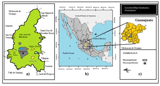 (a) High soil and water pollution of the Salamanca entity, (b), Guanajuato location in the Mexican Republic Map (c) Salamanca, the most Polluted entity area in Guanajuato. Source: Adapted from Google Earth (2020) [32].