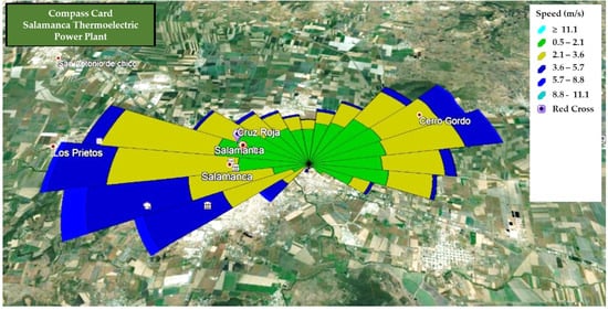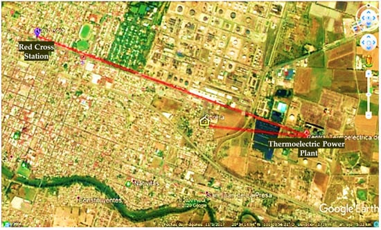Tract and dispersion of SO2 are indicated in the closest neighborhood on Salamanca’s Map from the TTP emission source monitored by the Red Cross station. Source: Adapted from Google Earth (2020) [32].