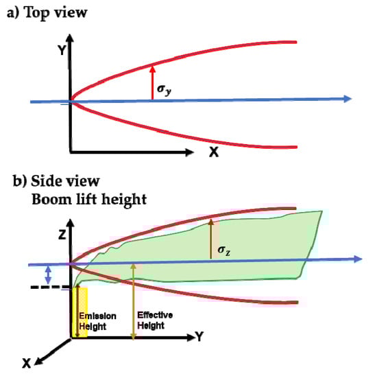 Along the horizontal axis (y axis), mass is assumed to be unproblematic for particle deposition, but on the vertical axis (z axis), it is deposited at a height H called the effective emission height; therefore, an axis shift must be performed using the following equation: