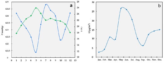 The historical Red Cross Station quality data were analyzed [34] to calculate the monthly and annual average pressure, temperature, wind speed, and direction. Figure 5a shows the monthly average 24 h pressure, which varies between 621.3 and 624.8 mmHg, while the temperature under the same conditions ranges from 17.8 to 22.5 °C in 2017. In Figure 5b, the monthly average SO2 concentrations range between 2.64 and 14.96 μg/m3. Meanwhile, the maximum and minimum values were recorded in the warm and cold seasons, respectively.