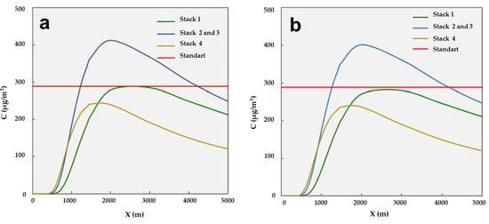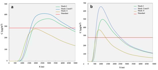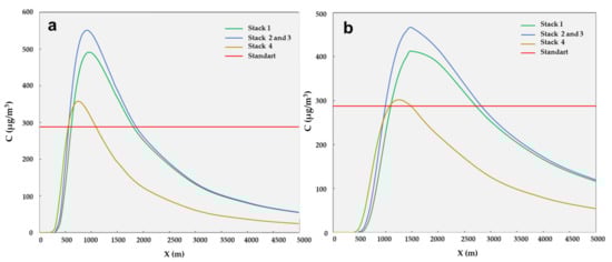 The modeling of scenario 1 (Figure 8a) shows ASC A with strong and moderate irradiation at a wind speed of 2.4 m/s during the day in the 4 stacks: stack 1 recorded an SO2 concentration of 490 μg/m3 at 1000 m while stacks 2 and 3, with the same dimensions, reached a maximum value of 551 μg/m3 at 900 m. Finally, at 700 m, stack 4 reached a concentration of 355 μg/m3. With respect to the scenario modeling 2 with ASC B, the maximum SO2 concentrations (μg/m3) for stacks 2 and 3, 1, and 4 were 467 μg/m3 at 1500 m, 413 μg/m3 at 1500 m, and 301 μg/m3 at 1300 m (see Figure 8b), respectively. The results were above the limits established in the Official Mexican Standard, 2010 (NOM-DOF 2010).