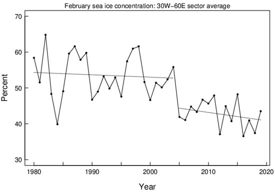 February sea ice concentrations averaged from 30° W to 60° E and north of 70° N (solid line through bullet points). Dotted lines show linear trends for two objectively determined periods (January years 1980–2004 and 2005–2019). The RMS errors about the averages are 6.0 and 3.6 for the first and second periods, respectively.