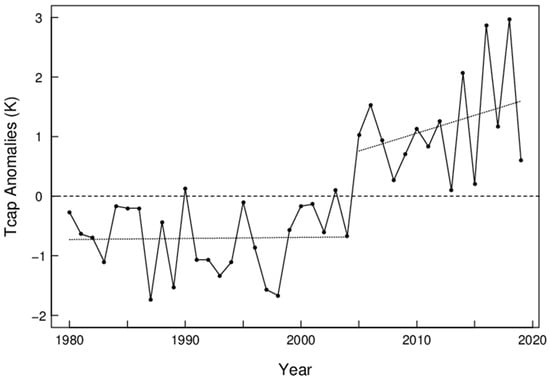 The largest decreases in sea ice concentration in winter have occurred in the region covering the Greenland Sea, the Norwegian Sea, and the Barents Sea (the Nordic seas), which is also in the main path of moisture intrusions into the Arctic during winter [34]. Figure 1 shows the February sea ice concentration in the sector from 30° W to 60° E. Straight lines show the linear regressions for the two periods before and after the break-point, respectively, with a step-change of sea ice concentration, from 53% to 44%, at the break-point. The root-mean-squared (RMS) errors are 6.0% and 3.6% for the first and second time periods, respectively. The negative trend (%/year) is greater in magnitude in the second than the first period (−0.23 ± 0.22 s.e. and −0.066 ± 0.17, respectively), although statistically insignificant (Figure 1). The DJF mean Tcap anomalies are shown in Figure 2, in which a step-change of Tcap (1.45 K) is objectively determined as for sea ice. A trend of near-zero is shown for Tcap from 1980–2004 (January year), and a positive trend (0.06 K/year) from 2005–2019. The step-changes shown in Figure 1 and Figure 2 may indicate a cause-and-effect relationship between the SIC in the Nordic seas and Tcap and/or responses to a common cause. For instance, a Ural blocking regime has been found to be associated with winter warming and sea ice reduction in the Arctic [35,36,37]. It is interesting to examine the role of weather regimes on the observed Arctic environmental changes.