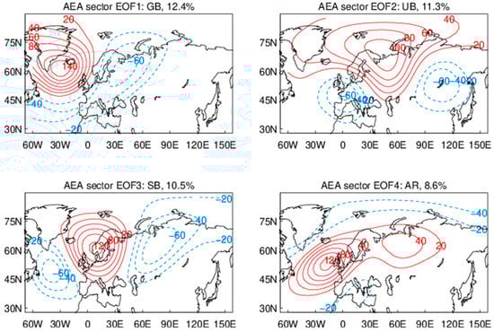 The patterns are named based on their positive phases and referred to as “Greenland blocking” (GB), “Ural blocking” (UB), “Scandinavian blocking” (SB), and “Atlantic ridge” (AR). Here “blocking” is not based on the traditional definition but on the spatial and temporal scales of height anomalies. The GB resembles the negative phase of the North Atlantic oscillation (NAO), and the AR resembles the negative phase of the eastern Atlantic pattern [5]. The center (peak anomaly) of AR is about 10° (latitude) southeast of the center of GB. The SB and UB resemble Eurasia 1 and 2 patterns [5], respectively. They both show a “wave train” (low–high–low) pattern and their centers are about 35° (longitude) apart. Note that the SB and AR patterns shown in Figure 1 are similar but not the same as those defined in [38] due to different analysis domains and classification methods between the two studies.