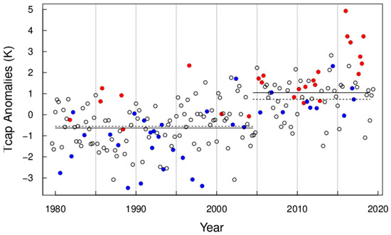 The mean Tcap is −0.63 K (s.d. = 1.02) during 1979–2004 and 1.05 K during 2005–2019, respectively. When the red and blue data points are excluded, the mean Tcap in Figure 4 (Figure 5) is −0.55 K (−0.50 K) and 0.73 K (0.76 K) before and after the break-point, respectively. The occurrence frequencies for blue and red symbols are 19% and 6%, respectively, in the first period, versus 13% and 24% in the second period in Figure 4. The occurrence frequencies for blue and red symbols are 28% and 13%, respectively, in the first period, versus 16% and 31% in the second period in Figure 5. The step-change excluding the red and blue points (dashed lines) is 1.26 K, compared to 1.68 K for all data points (solid lines). The change unrelated to the red and blue weather regimes is 75% (=1.26/1.68) of the total (Figure 5). Changes in weather regimes may have contributed 25% of the step-change of Tcap. This is in agreement with a previous study [18] that shows the horizontal advection of heat is critical in explaining the variability, but not the mean, of the lower tropospheric temperature. Over the Barents–Kara Seas, an analysis of the heat budget indicates that temperature increase in the lower troposphere is almost equally partitioned into turbulent flux, horizontal advection, and greenhouse effect [18].