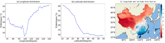 Spatial distribution of TCWV during 2002–2022 in China. (a) Longitude distribution. (b) Latitude distribution. (c) Longitude and latitude distribution.