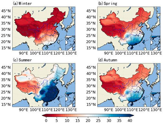 TCWV of China in each season. (a) Winter. (b) Spring. (c) Summer. (d) Autumn.