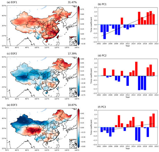 To further study the spatiotemporal variations of the TCWV, an EOF analysis was performed on TCWV from the AIRS dataset to identify the dominant modes of year-to-year variation. The spatial distribution of the three leading EOF modes and their corresponding time series are presented in Figure 3. This shows that the cumulative variance contribution rate of the first three modes of EOF analysis of TCWV is 59.73%, that is, the change information of the first three modes representing the original variable field is 59.73%. Therefore, the spatial distribution of the first three eigenvectors can represent the main distribution type of the TCWV throughout the year. The first three modes of EOF were mainly analyzed as follows. Figure 3a shows that the first EOF mode of TCWV variation accounts for 31.47% of the total variance during 2003–2021, indicating that the TCWV has good convergence in space. The TCWV values of the first spatial mode of EOF is positive in most areas except for the southwest border, which is basically the inverse northwest–southeast type. From Figure 3c, the second spatial mode of EOF analysis value of TCWV is low in most areas except for the northeast of China, indicating the consistency of TCWV distribution in China. From Figure 3e, the value of TCWV of the third spatial mode of EOF presents a ‘positive-negative’ pattern from south to north and the maximum on the Tibetan Plateau. In addition, the time coefficient corresponding to the feature vector represents the time variation characteristics of the distribution pattern characterized by the feature vector in the region. The results of the first temporal mode and the third temporal mode of EOF analysis demonstrate that TCWV has shown similar increasing trends over the past 19 years (Figure 3b, f) except for the second temporal mode of the TCWV of EOF (Figure 3d).