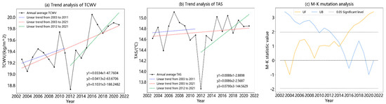 The M-K mutation test method was used to analyze the annual average TCWV in China, and the UF and UB curves of the M-K mutation test were plotted. It can be seen from Figure 4c that the time series of annual average TCWV in China from 2003 to 2021 is at the 0.05 significance level of an M-K mutation test, and there is an intersection between UF statistics and UB statistics in 2014, indicating that 2014 is the year of significant mutation of the annual TCWV series. The corresponding UF value is greater than 0, indicating that the intersection is the mutation point of the rise in annual average TCWV. From 2003 to 2005, UF values were less than 0, indicating a downward trend in TCWV; after 2005, the UF values were greater than 0, indicating an upward trend in TCWV during this period; after 2017, the UF values were greater than 1.96, indicating that the trend of the increase in the average TCWV during this period was obvious.