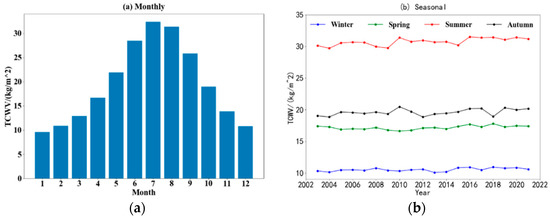 Monthly and seasonal variation of TCWV in China (2003–2021). (a) Monthly. (b) Seasonal.