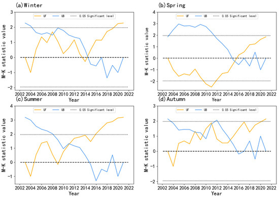 Mann-Kendall statistic curve of TCWV in seasonal in China. (a) Winter. (b) Spring. (c) Summer. (d) Autumn.