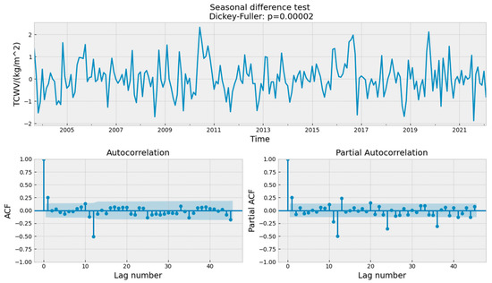 Time series, autocorrelation and partial autocorrelation of TCWV after seasonal difference.