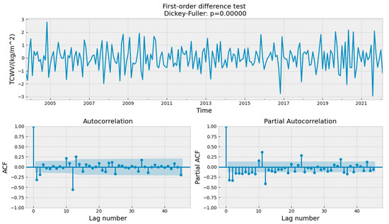 Time series, autocorrelation and partial autocorrelation of TCWV after first-order difference.