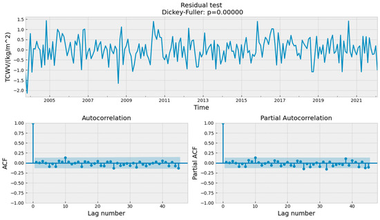 The SARIMA model was used to predict the TCWV in China, and the monthly average value of TVWV from September 2002 to February 2022 was used as the original sample. The time series diagram and autocorrelation partial correlation diagram of TCWV are shown in Figure 7, and the lag of the autocorrelation coefficient in Figure 7 is set to 45. It can be seen from Figure 7 that the variation range of TCWV data is 10~35 kg/m2. The Dickey-Fuller (DF) unit root test was performed on it, and a p-value = 0.39810 was obtained, meaning that the data accepted the null hypothesis, which implies that the data are non-stationary. Seasonal fluctuations in a time series can lead to the non-stationarity of a time series, which can be analyzed by constructing a SARIMA model. Therefore, seasonal difference and first-order difference were performed on the time series to make the data become stable.