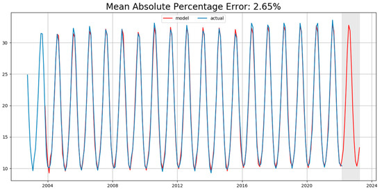 The timing diagram of the finally drawn prediction sequence is shown in Figure 11. The abscissa represents the month, and the ordinate represents the values of TCWV. The blue curve is the true value, the red curve is the predicted value, and the red curve of the shadow part is the monthly average trend of TCWV in the next full year. It can be seen from Figure 11 that the predicted values are in good agreement with the actual ones. Furthermore, the mean absolute percentage error (MAPE), mean square error (MSE) and R2-score were calculated to judge the SARIMA model. The MAPE is 2.65%, MSE is 0.3229 and R2-score is 0.9949. This means that the prediction model is relatively accurate.