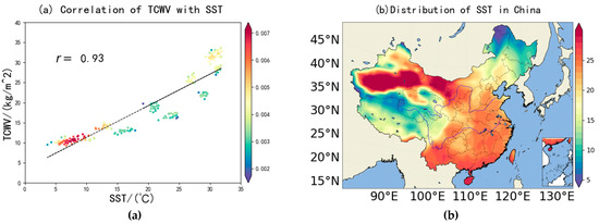 The relationship between TCWV and SST. (a) Correlation of TCWV with SST. (b) Distribution of SST in China.