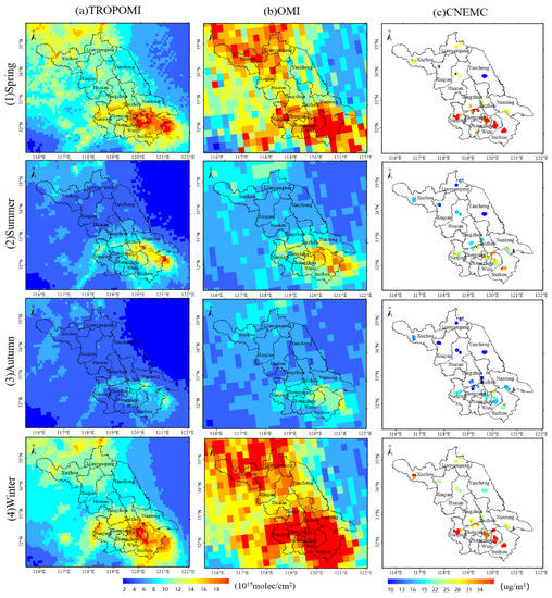Seasonal averaged NO2 in (1) spring, (2) summer, (3) autumn and (4) winter over Jiangsu from the (a) TROPOMI, (b) OMI and (c) CNEMC.