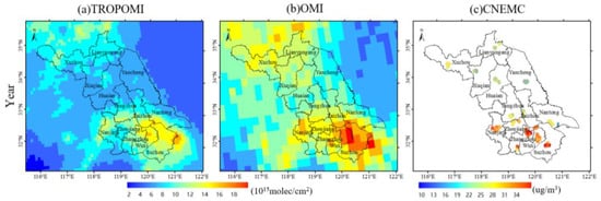 Annual averaged NO2 in Jiangsu from (a) TROPOMI, (b) OMI and (c) CNEMC.