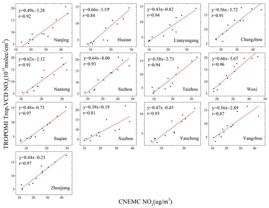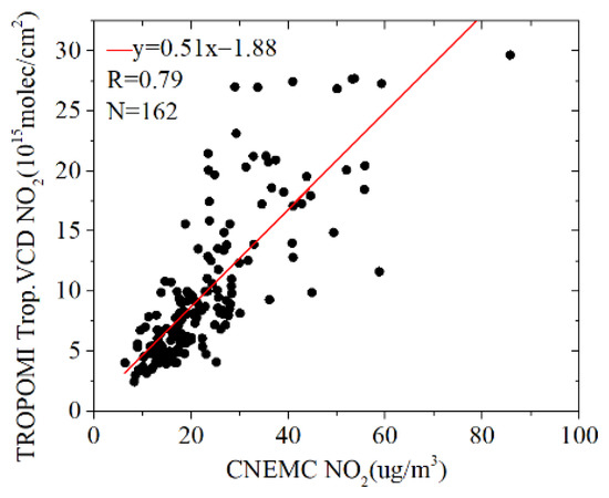 - At the urban level, the mass concentration of NO2 in 13 prefecture-level cities of Jiangsu Province was highly correlated with the monthly average of the Trop NO2 VCD given by TROPOMI, with the value of r ranging from 0.81 to 0.97, which shows that TROPOMI provides an assessment of its applicability in monitoring urban pollution levels. At the provincial level, the r between TROPOMI and the CNEMC sites is 0.9. It further indicates that TROPOMI data can better reflect NO2 concentration pollution in areas without ground station monitoring.