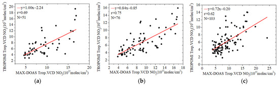 Comparison of the daily averaged MAX-DOAS and TROPOMI in the different matching grids in 2019. (a) 0.05° grid, (b) 0.1° grid, and (c) 0.2° grid.