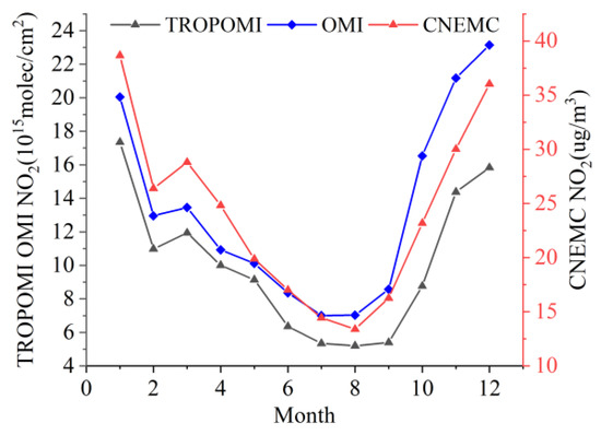 Comparison of the monthly averaged NO2 mass concentration at CNEMC compared with the TROPOMI and OMI Trop NO2 VCD in 2019.