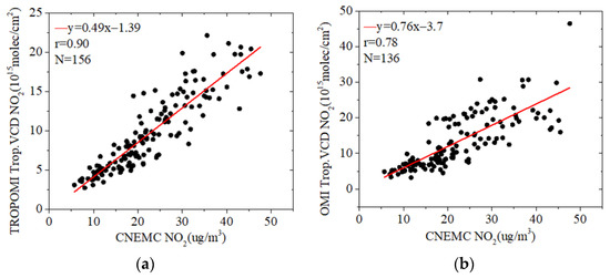 Scatterplot of the monthly averaged NO2 concentrations from CNEMC, TROPOMI and OMI NO2, respectively. (a) CNEMC and TROPOMI, (b) CNEMC and OMI.