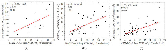 Comparison of the daily averaged MAX-DOAS and OMI in the different matching grids in 2019. (a) 0.1° grid, (b) 0.2° grid, and (c) 0.25° grid.