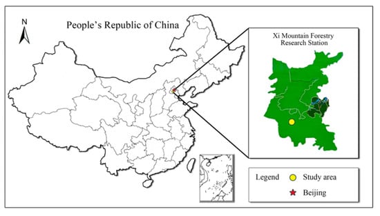 The study location is in a typical temperate forest in the Xi Mountain Forestry Research Station of Beijing Forestry University (39°54′ N, 116°28′ E; 133 m a.s.l.) near Beijing (Figure 1). The study site is in a temperate monsoon humid climate region. The annual mean temperature and annual precipitation at the station are approximately 12.5 °C and 628.9 mm, respectively. The soil type is classified as Chromic Luvisols with a soil thickness of approximately 40 cm. The O horizon is less than 3 cm, and the A horizon is about 3–5 cm. The study was conducted in plantations where Quercus liaotungensis is the dominant tree species with a density of 2963 trees ha−1. The age of the plantation is 62 years and it has not experienced any disturbance. Very few shrubs and herbs occurred in the experimental site. Soil samples (0–5 cm deep) at the study site were collected to measure the physicochemical properties at the beginning of the experiment as the background data. The initial tree height and diameter at breast height (DBH) of the sample trees in each plot were recorded. The initial conditions of the plots under different treatments were not statistically significant (Table 1).