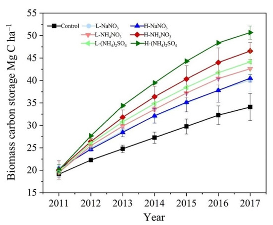 Biomass carbon storage in the N addition plots from 2011 to 2017. Capital letters L and H represent nitrogen addition of 50 and 150 kg N ha−1 yr−1, respectively. Vertical bars represent ± SE (n = 3).