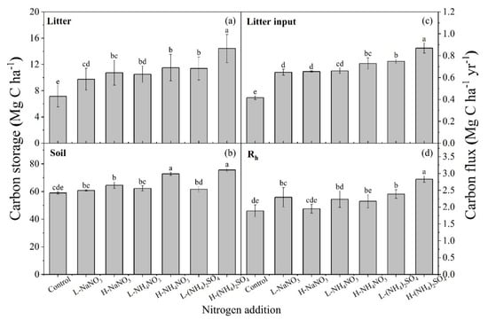Carbon storage of litter (a) and soil (b) in 2017, the annual average carbon input from litter decomposition (c), and the annual average soil heterotrophic respiration (Rh), (d). Capital letters L and H represent nitrogen addition of 50 and 150 kg N ha−1 yr−1, respectively. Means with different lowercase letters in the same column are significantly different at p < 0.05. Vertical bars represent ± SE (n = 3 in (a,b); n = 6 in (c,d)).