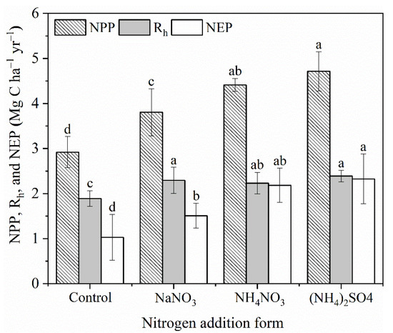 Comparison of net ecosystem productivity (NEP), soil heterotrophic respiration (Rh), and net primary productivity (NPP) under different nitrogen forms. Values labeled with the same lowercase letter do not differ significantly (p < 0.05). Vertical bars represent ± SE (n = 3).