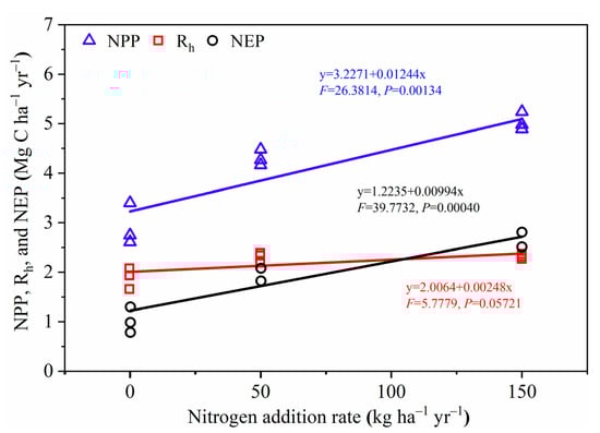 Relationships between the changes in net primary productivity (NPP, triangle), heterotrophic respiration (Rh, square), and net ecosystem productivity (NEP, circle) and nitrogen addition level.