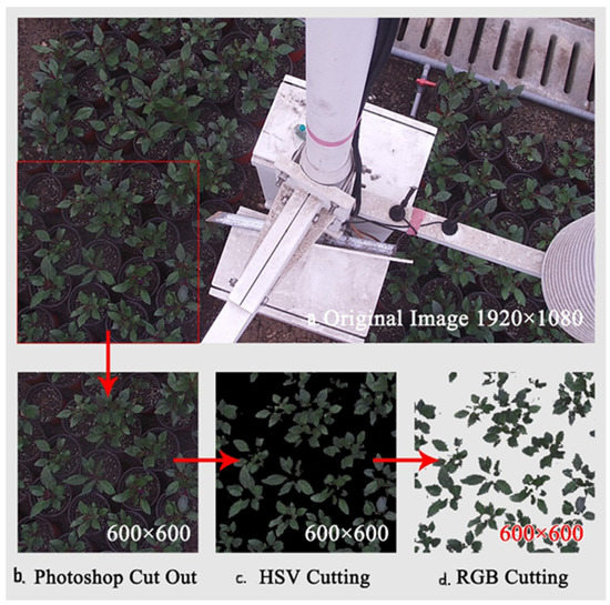 - The rgb2hsv function of MATLAB was used to convert RGB images into HSV images. Double cycle operation was used to set the H-value of the image background to 0 (i.e., black), while the H value of the plant remains unchanged. The hsv2rgb function was used to convert the processed HSV image into an RGB image (Figure 2c).