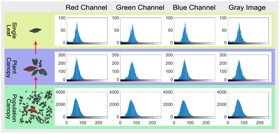 Digital color images’ information can reflect the growing state of plants [11], which provides a convenient way of plant growth monitoring. Research on conducting qualitative and quantitative descriptions of phenotypic traits for plant appearance by using digital imaging technology has increased in smart agriculture [6]. The RGB color model has been widely used to process digital color images to study chlorophyll content and its related plant nutritional status and stress response [24,46,47]. The RGB model and leaf color parameters can describe changes in tobacco leaf color depth and homogeneity [33]. Now, we found that images of the RGB channels and the gray-level images all showed a skewed distribution at the single leaf, plant, and population canopy images scale in BFH.
