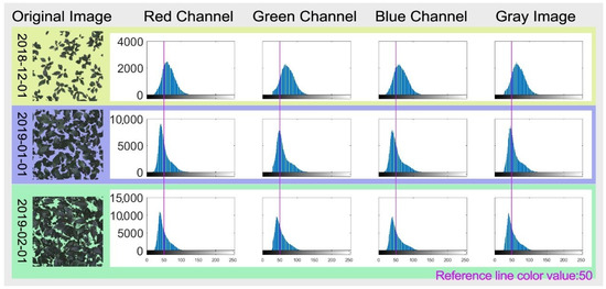 The main distribution of color gradation is positive skewness for RGB channels and the gray-level image near the value of 0. This increment of positive skewness as the canopy develops reflected the leaf color transit from light green to dark green (Figure 4).