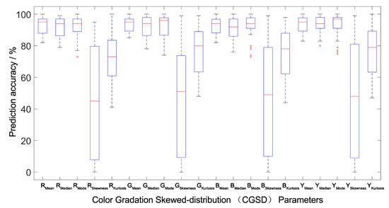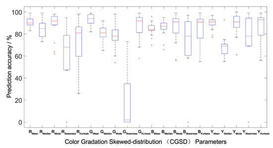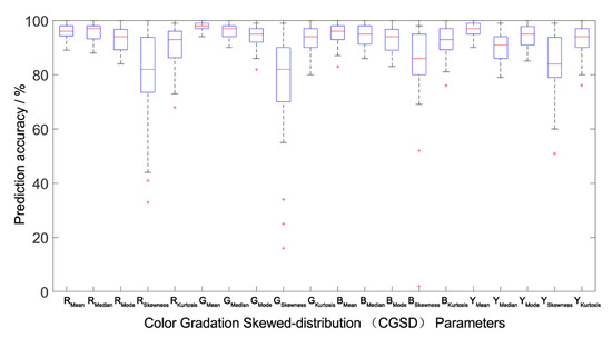 Prediction accuracy interval analysis of the population canopy color-meteorological response models of the outside-group. The Boxplot function of MATLAB was used to draw the accuracy percentile distribution diagram of the population canopy CGSD parameters prediction model. The blue box in the figure represents the prediction accuracy of the model distributed between 25% and 75%. The shorter the box, the better the degree of data concentration. The red line in the box represents the median distribution of prediction accuracy, and the dotted line at both ends outside the box represents the endpoint value (maximum and minimum) of the prediction data distribution. The shorter the distance between the two endpoint values, the better the degree of data concentration. The red cross outside the box represents abnormal data. The fewer abnormal data, the better the degree of data distribution concentration.
