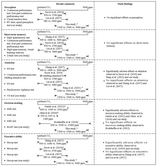 | Liu et al. [14] | 380 vs. 3000 ppm b | 180 min | 12 | Mental redirection; grammatical reasoning; digit span memory; visual learning memory; number calculation; Stroop test; visual reaction time; D2 test; Tsai–Partington test. | No significant effect | |