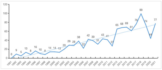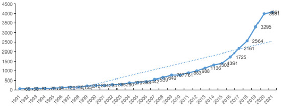According to the statistical analysis results of 29,422 English documents received in the core collection of Web of Science, the number of documents on the relationship between air pollution and public health is on the rise, especially after 1999, from 212 in 1999 to 4061 in 2021, as shown in Figure 2.